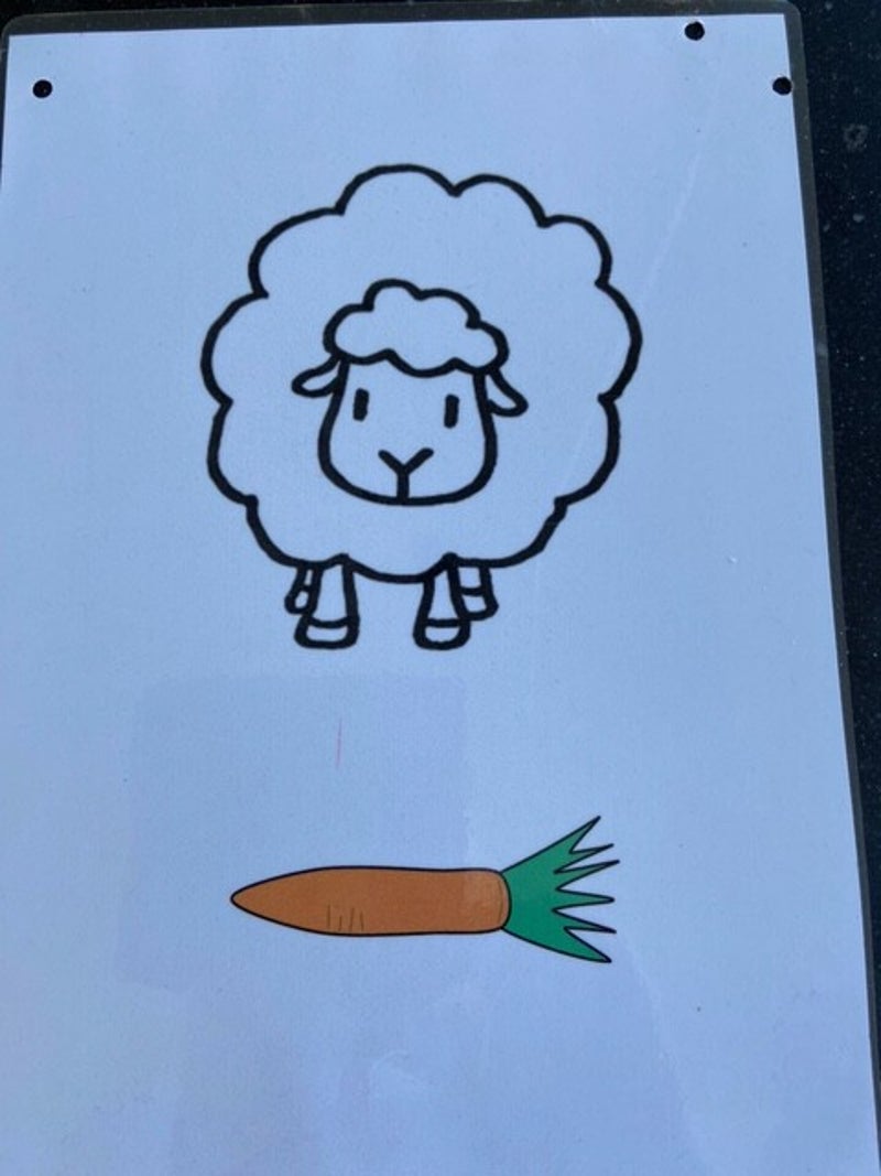 De kinderen moesten de posters met het schaapje en daaronder de oranje wortel volgen. De wortel wees de weg langs wel 15 huizen met een kleurrijke poster van een kippenfamilie achter het raam. Voor de zekerheid hadden hun begeleiders de route kunnen downloaden en zo konden we ook een beetje inschatten hoeveel deelnemers er zouden zijn.